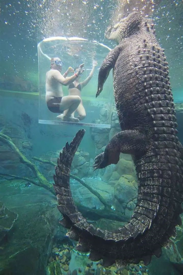 这是澳大利亚一个景区的付费项目,消费者可以待在一个受保护的透明笼子里,近距离观察咸水鳄(这是现存最大的爬行动物)。