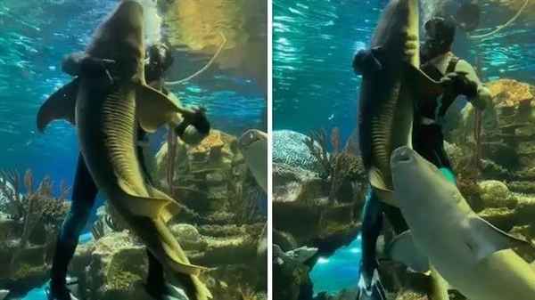 水族馆里经过训练的鲨鱼还可以和训练师一起跳舞:
