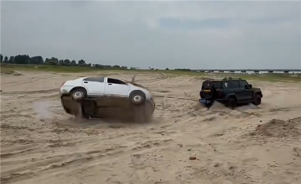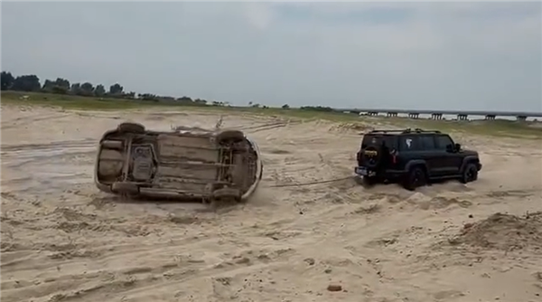 好消息是这台QQ车比较轻,所以坦克300驾驶员一脚油门就将它拖离了原地;坏消息是,由于用力过猛,直接将QQ给拽翻车,整个侧卧到沙地上,露出了底盘。
