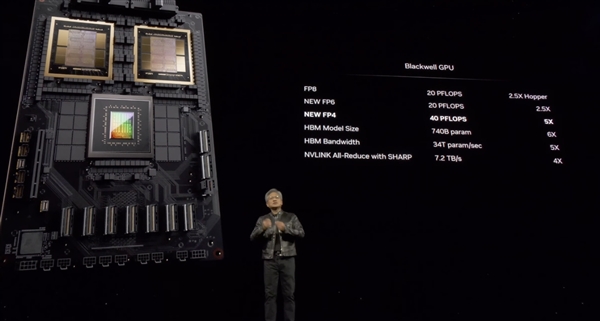 据介绍,Blackwell GPU体积庞大,采用台积电的4纳米(4NP)工艺制程,将两块芯片整合到一起,使用10 TB/sec NVLink 5.0连接,共有2080亿个晶体管。